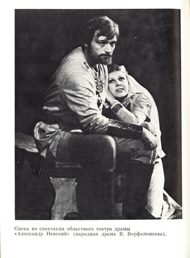 Новгород : краткий очерк истории города / В. Ф. Андреев, В. А. Варенцов, И. Н. Вязинин и др. – Л. : Лениздат, 1985. – 224 с. : ил. На иллюстрации сцена из спектакля «Александр Невский» по пьесе В. Ворфоламеева (1983 г.). В главной роли Ю. А. Цурило, в 1980-е гг. – актер Новгородского областного театра драмы. |