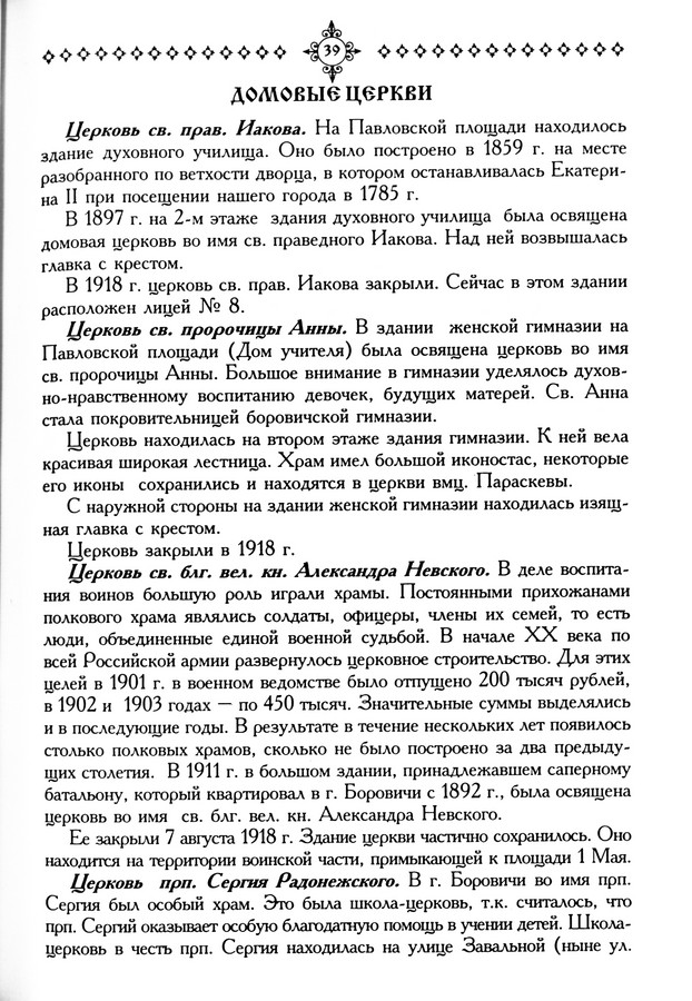 Полевиков А. П. Боровичский край : краеведческий сборник / А. П. Полевиков. – Санкт-Петербург : [б. и.], 200 . Вып.2 : Православные святыни. – 206 с. : ил. О домовой церкви святого благоверного князя Александра Невского (год постройки – 1911-й), принадлежавшей саперному батальону, расквартированному в Боровичах с 1892 г., здание сохранилось (с. 39). |