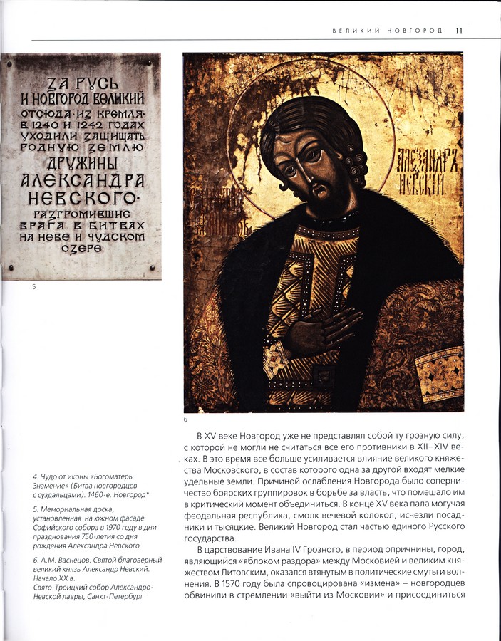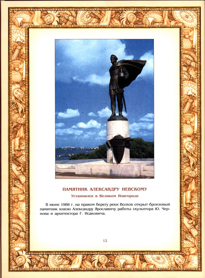 Великий Новгород – город воинской славы : 1945 – 2010 / ред. С. Лебедева. – Великий Новгород : Печатный двор «Великий Новгород», б. г. (2015 г.). – 12 с. : фот. цв. Памятные места города, связанные с его воинской славой, в т. ч. с именем князя Александра Невского: памятник на набережной Александра Невского; памятник-стела «Город воинской славы», на одном из скульптурных барельефов изображен «Разгром Александром Невским немецких рыцарей на Чудском озере» (скульпторы С. Гаев и В. Боровых); бюст Александра Невского на привокзальной площади и др. |